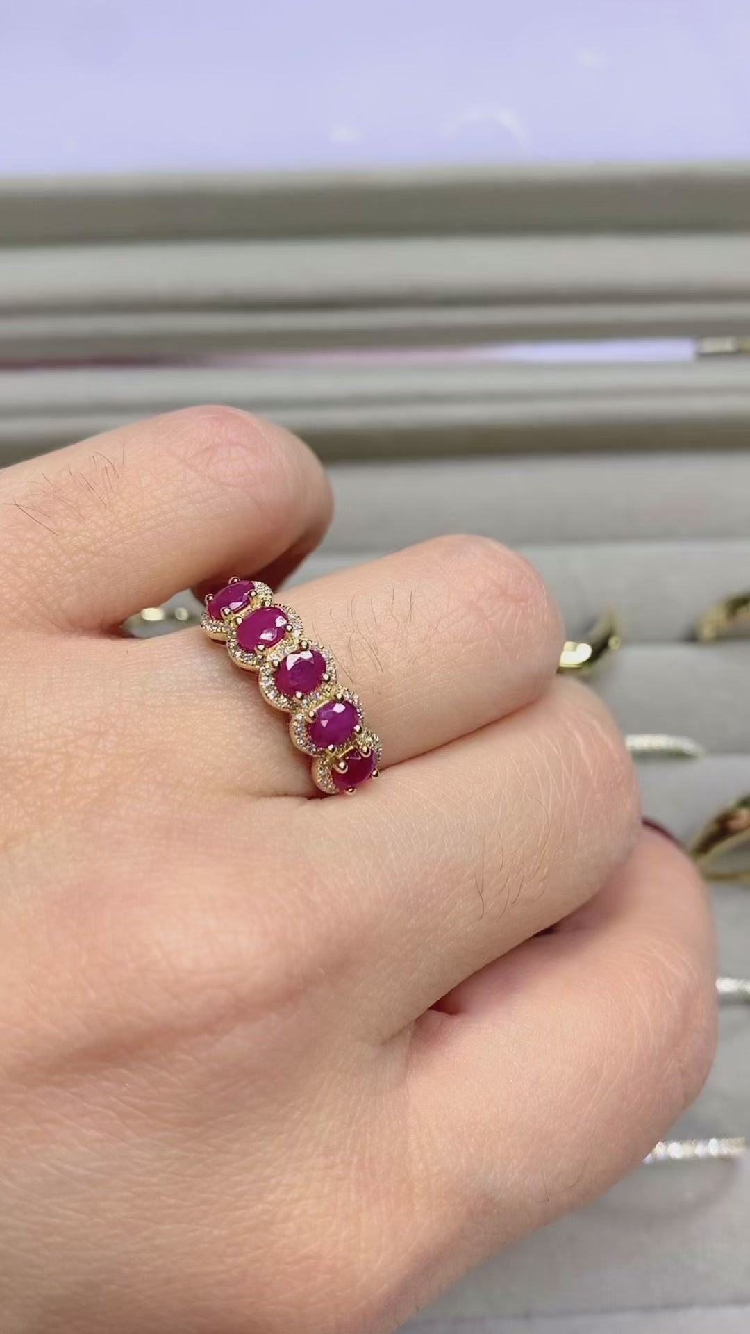 Anillo de Rubíes . Anillo en oro amarillo 14K con 68 Diamantes 0.17ct y 5 rubies de 0.95ct
